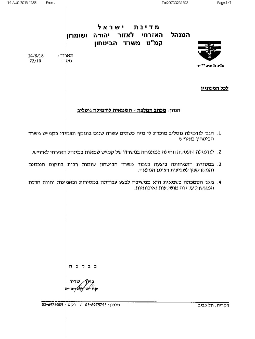 1. הגב’ לודמילה גוטליב מוכרת לי מזה כשתים עשרה שנים בתוקף תפקידי כקמ”ט משרד הביטחון באיו”ש.
